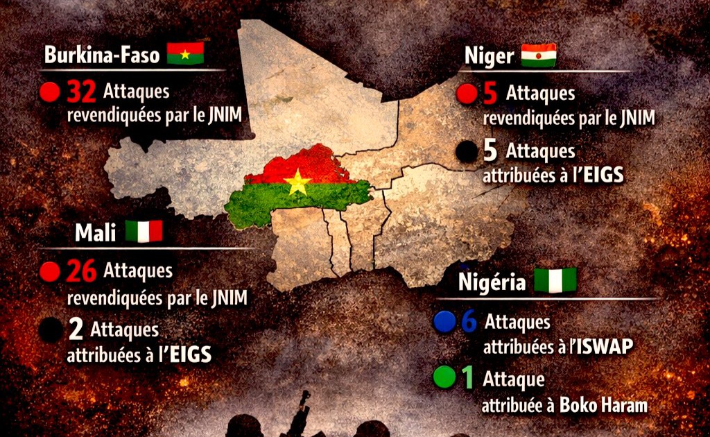 Au Niger, 10 attaques ont été comptabilisées, partagées entre le JNIM et l’EIGS, principalement dans la région des Tillabéri, frontalière du Mali et du Burkina Faso.