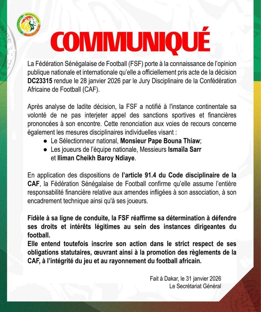Après analyse du verdict, la FSF a notifié à la CAF sa volonté de ne pas interjeter appel. Cette renonciation concerne également les mesures disciplinaires individuelles visant le sélectionneur national Pape Bouna Thiaw ainsi que les joueurs Ismaïla Sarr et Iliman Cheikh Baroy Ndiaye. Lire le communiqué ci-dessous :