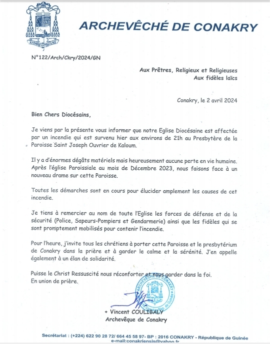 Communiqué de l’archevêché de Conakry: