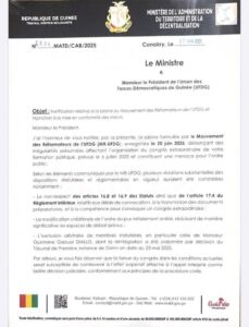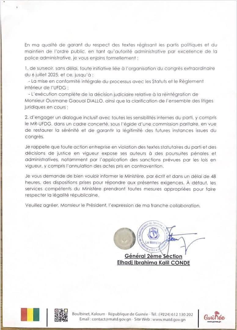 Dans un communiqué publié ce soir, le ministère de l’Administration du Territoire (MATD) a demandé au principal parti d’opposition, l’UFDG, de différer la tenue de son congrès extraordinaire, initialement prévu pour le 6 juillet. Selon les autorités, cette requête fait suite à des irrégularités signalées par une faction dissidente du parti ainsi qu’à une décision de justice restée sans exécution.
