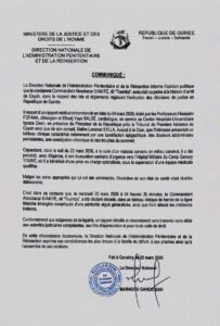 Selon le communiqué officiel, l’intéressé exécutait sa peine dans le respect des lois et règlements en vigueur. Un rapport médical circonstancié, établi le 4 mars 2026 par les Professeurs Houssein Fofana et Elhadj Yaya Baldé du CHU Ignace Deen, avait déjà relevé un état de santé préoccupant marqué par une tuméfaction épigastrique, des douleurs abdominales persistantes et des troubles du sommeil. Ci-dessous l’intégralité du communiqué :