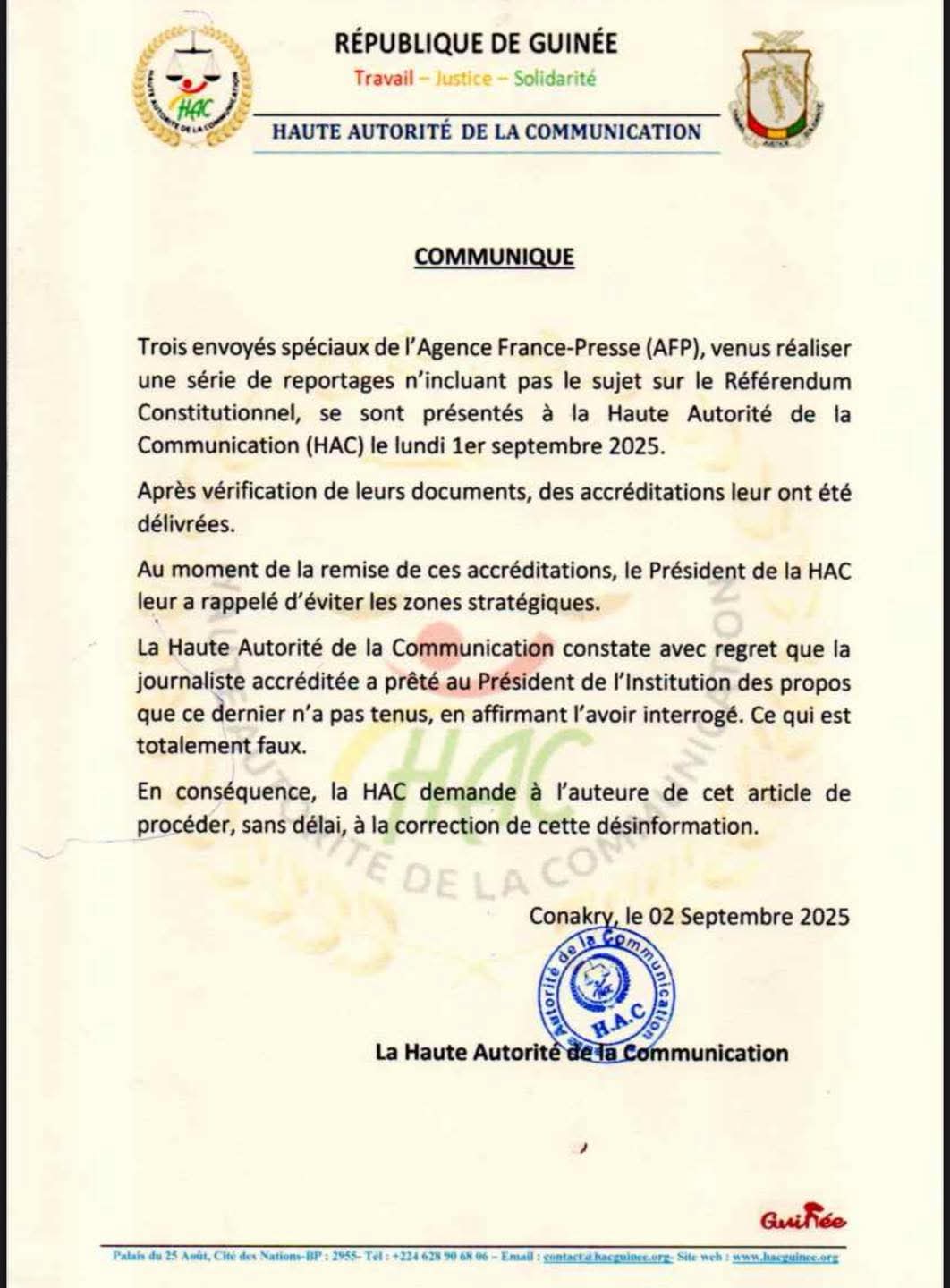 Le 1er septembre 2025, trois envoyés spéciaux de l’AFP ont été accrédités par la Haute Autorité de la Communication (HAC) pour une série de reportages ne portant pas sur le Référendum Constitutionnel. Lors de la remise des accréditations, le Président de la HAC leur a recommandé d’éviter les zones stratégiques. La HAC déplore ensuite qu’une journaliste ait attribué à son Président des propos qu’il n’a jamais tenus, et exige une correction immédiate de cette désinformation.