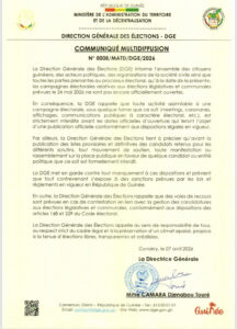 Afin de garantir la transparence et la crédibilité du processus électoral, la Direction Générale des Élections (DGE) rappelle à l’ensemble des citoyens et acteurs politiques que les campagnes électorales pour les élections législatives et communales prévues le 24 mai 2026 ne sont pas encore ouvertes. Le respect strict du calendrier légal est une condition essentielle pour préserver un climat apaisé et assurer des élections libres et équitables.