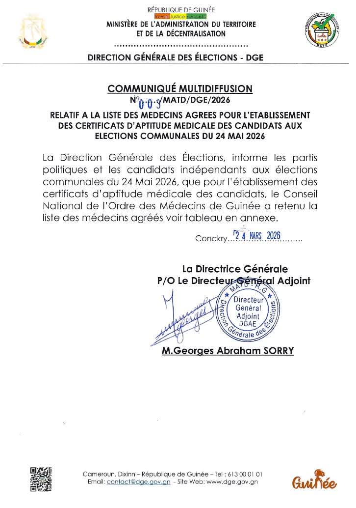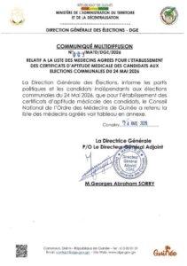 La Direction générale des élections (DGE) a annoncé, dans un communiqué rendu public ce mardi 24 mars 2026, la liste officielle des médecins habilités à délivrer les certificats d’aptitude médicale exigés pour les candidats aux élections communales prévues le 24 mai prochain.