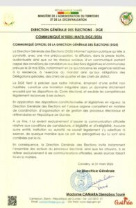 Alors que le pays se prépare à un rendez-vous démocratique majeur, la Direction Générale des Élections (DGE) dénonce la diffusion de messages irréguliers relatifs aux candidatures. Elle rappelle que la transparence et la crédibilité du scrutin reposent sur ses communications officielles, et appelle les électeurs, les partis et les médias à la vigilance afin de préserver l’intégrité du processus électoral.