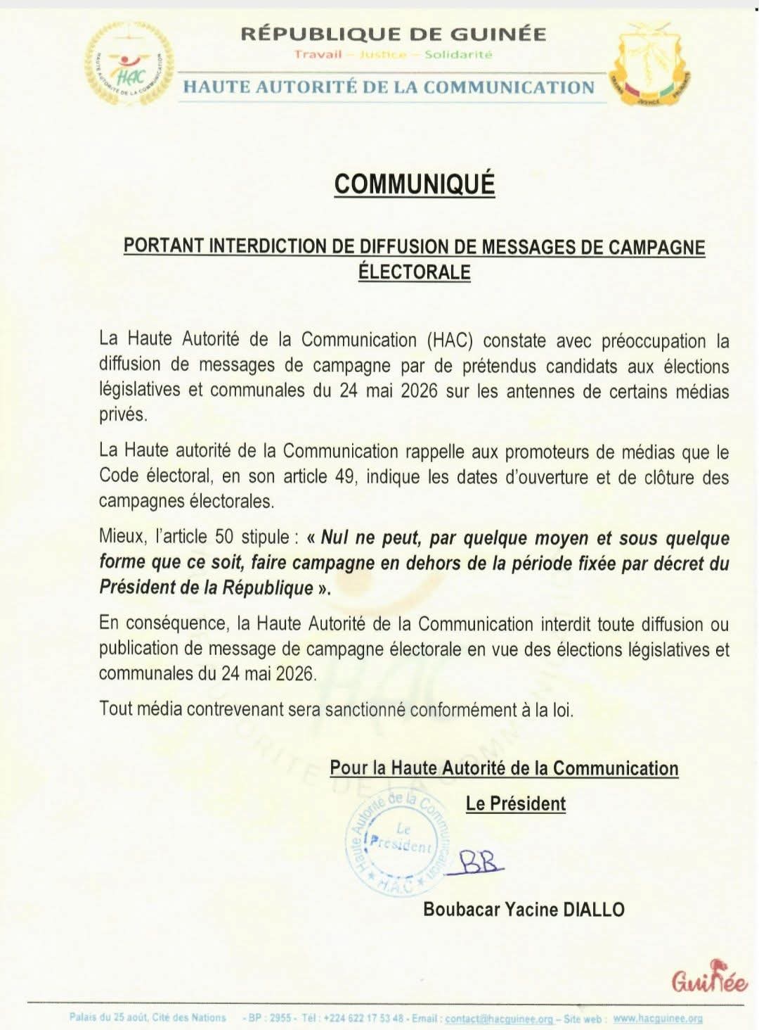 Conakry, 2 mars 2026 – La Haute Autorité de la Communication (HAC) a annoncé l’interdiction formelle de toute diffusion ou publication de messages de campagne électorale avant l’ouverture officielle de la période fixée par décret présidentiel, en vue des élections législatives et communales prévues le 24 mai 2026. Le communiqué ci-dessous :