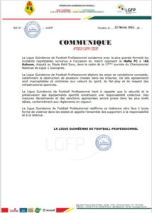 La ligue Professionnel (LGFP) exprime sa plus vive indignation face aux incidents regrettables survenus lors du match opposant le Hafia FC à l’AS Kaloum, disputé le dimanche 23 février 2026 au Stade Petit Sory, dans le cadre de la 17ᵉ journée du Championnat National de Ligue 1 Guicopres.