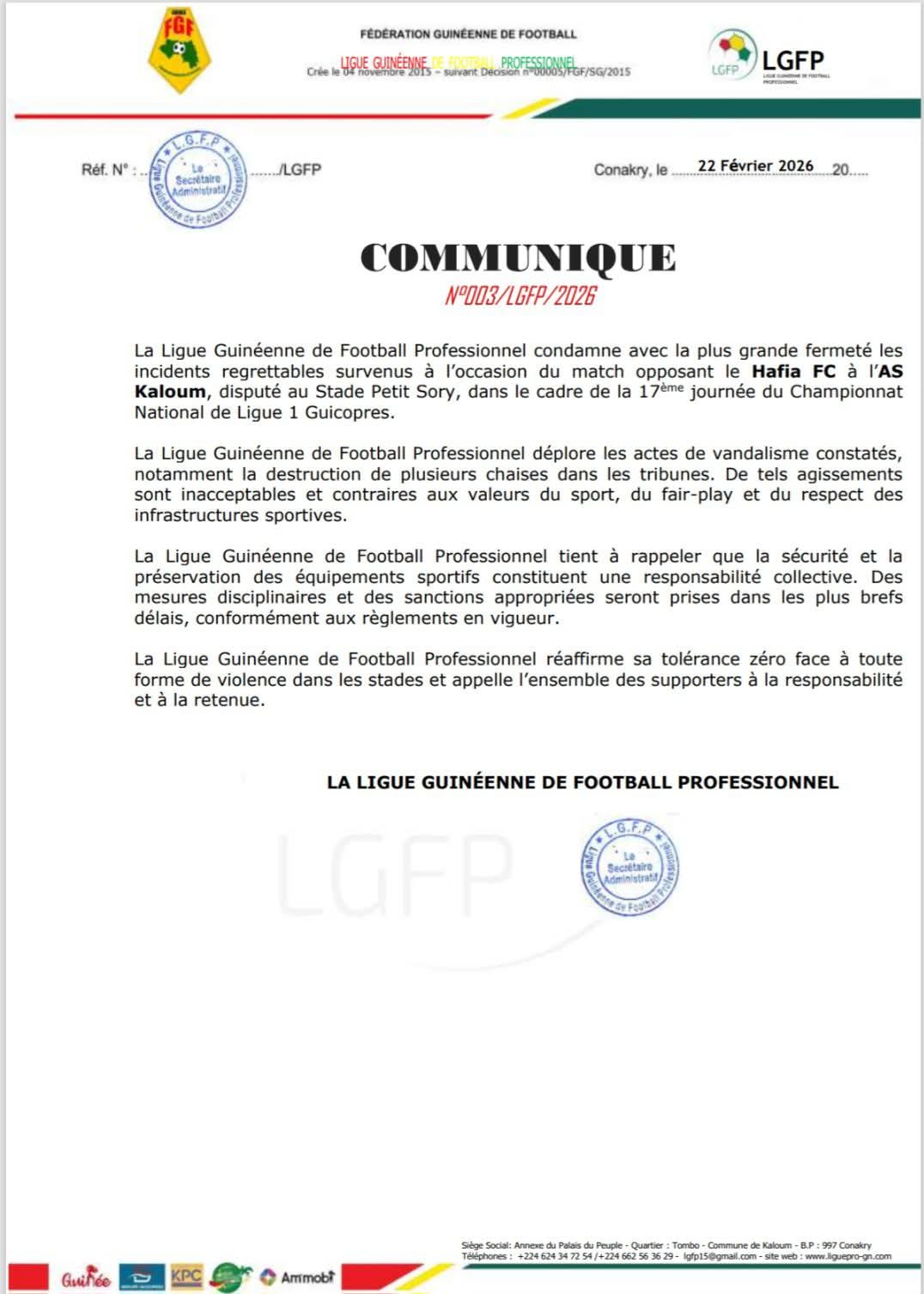 La ligue Professionnel (LGFP) exprime sa plus vive indignation face aux incidents regrettables survenus lors du match opposant le Hafia FC à l’AS Kaloum, disputé le dimanche 23 février 2026 au Stade Petit Sory, dans le cadre de la 17ᵉ journée du Championnat National de Ligue 1 Guicopres.