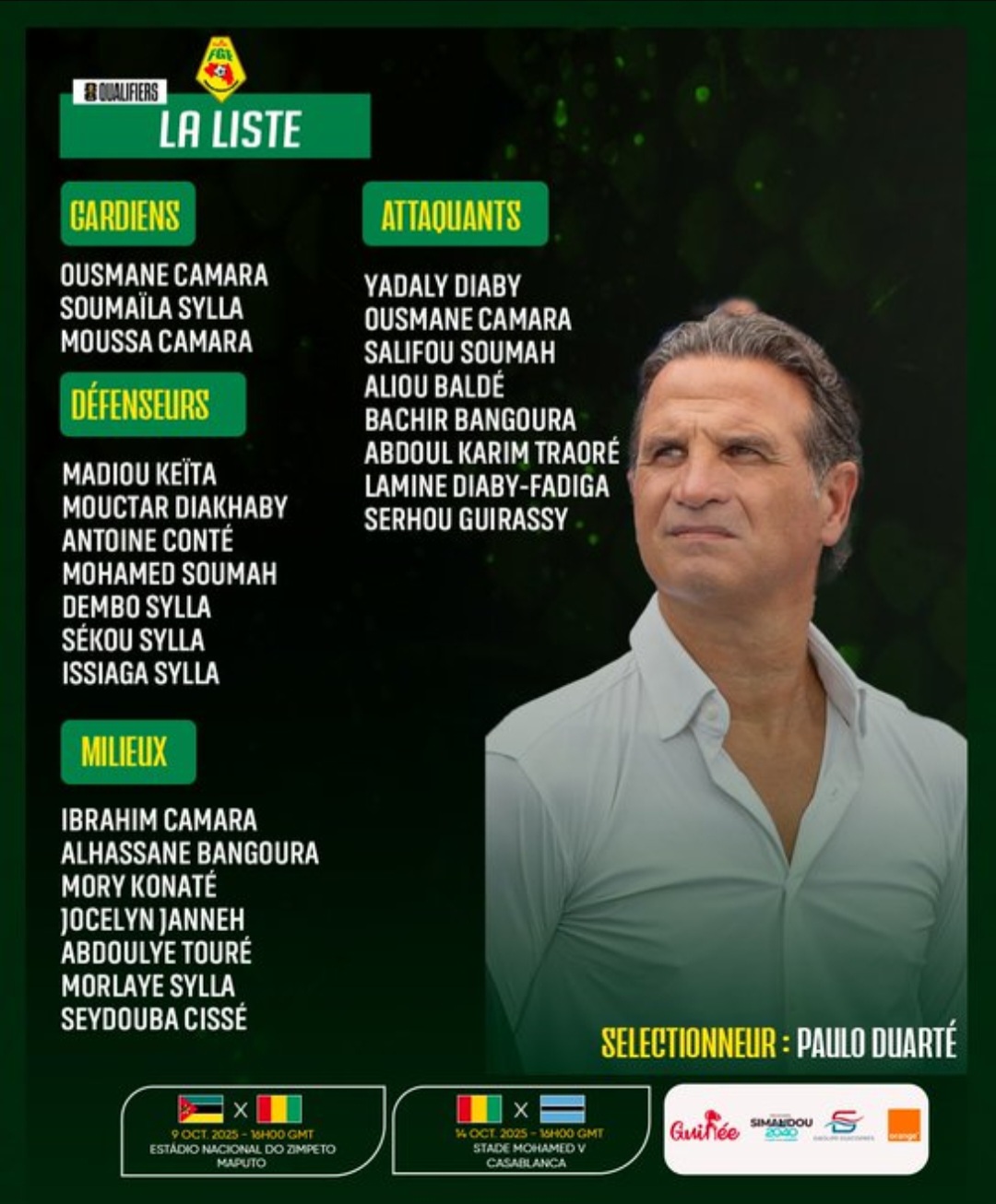Liste des joueurs convoqués par le sélectionneur du Syli National, Paulo Duarté, pour les matchs Mozambique – Guinée, prévu le 9 octobre 2025 à 16h GMT à l’Estádio Nacional do Zimpeto et Guinée – Botswana du 14 octobre 2025 à 16h GMT au Stade Mohamed V de Casablanca, dans le cadre des 9ᵉ et 10ᵉjournées des Éliminatoires de la Coupe du Monde FIFA 2026.