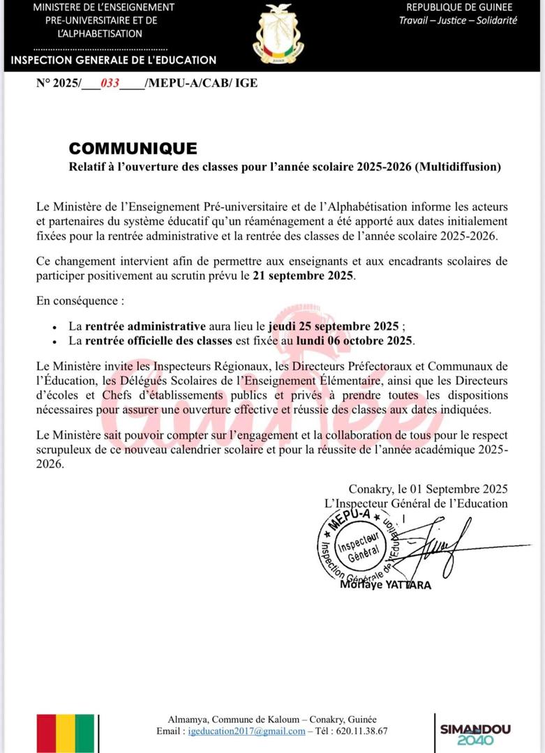 Le Ministère de l’Enseignement Pré-universitaire et de l’Alphabétisation (MEPU-A) a annoncé, par voie de communiqué officiel (réf. 2025/033/MEPU-A/CAB/IGE), un réaménagement des dates de la rentrée scolaire pour l’année académique 2025-2026. Cette décision stratégique vise à permettre aux enseignants et encadrants scolaires de participer pleinement au scrutin national prévu le 21 septembre 2025. Lire le communiqué ci-dessous :