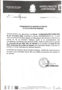 Dans un communiqué qui vient de nous parvenir, le ministre du Travail et de la Fonction Publique, Marc Julien Yombouno a informé les travailleurs du secteur public et privé guinéens que les journées du mercredi 28 et jeudi 29 juin 2023 sont déclarées fériées, chromées et payées sur toute l’étendue du territoire national. Ci-dessous le communiqué: