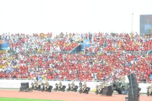 Entre 6 h 30 et 8 h 30, l’axe menant au stade Général Lansana Conté s’est mué en un décor saisissant. Les routes, habituellement encombrées de véhicules, se sont offertes à une marée humaine déterminée. Les délégations officielles se mêlaient aux citoyens venus en masse, et le ronron des moteurs s’effaçait devant l’écho des chants, des slogans et des couleurs nationales. La sécurité, omniprésente, encadrait l’événement, mais c’est la ferveur des Guinéens qui imposait son rythme et son intensité.