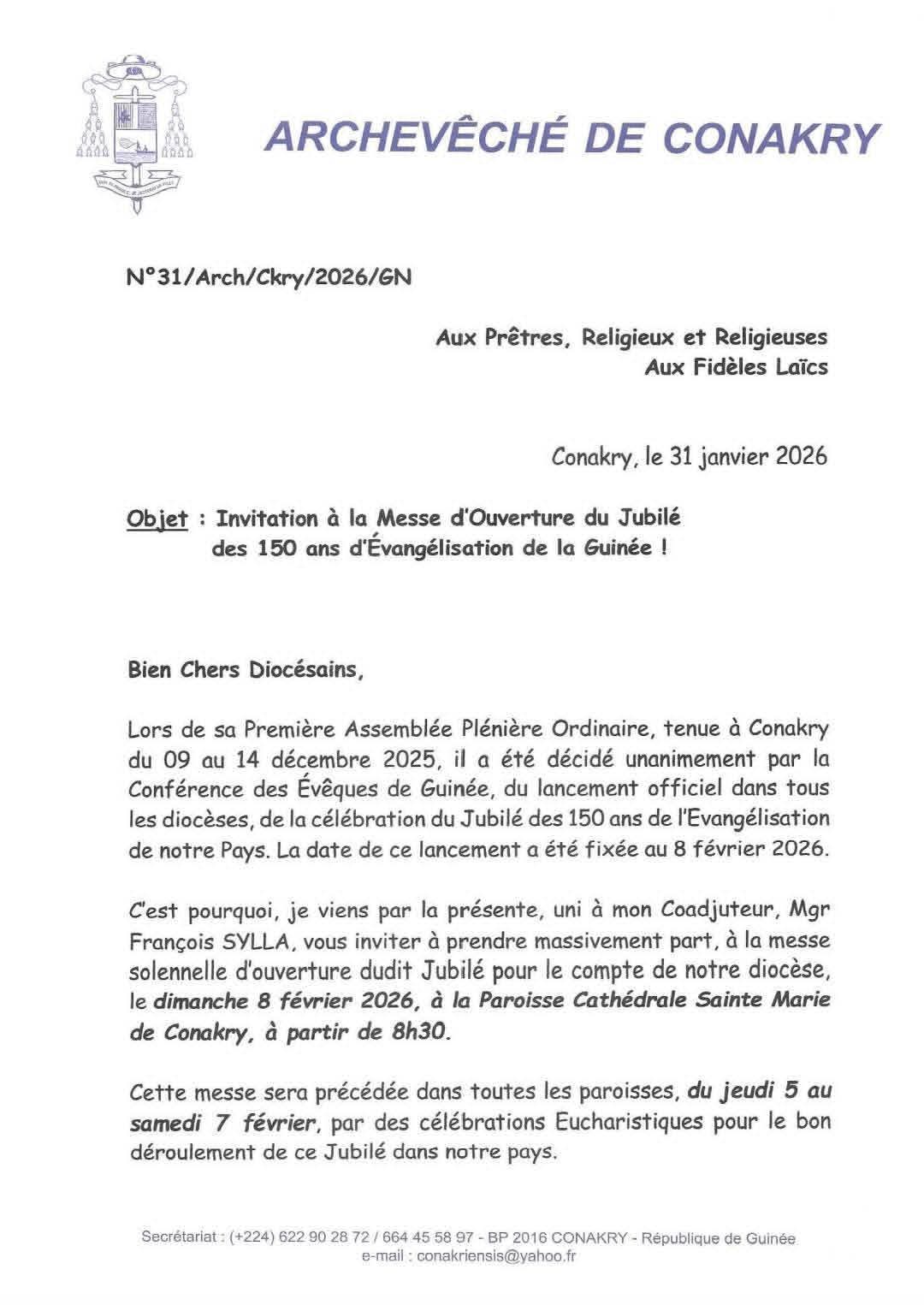 Ledit lancement, sera précédé par des célébrations eucharistiques dans toutes les paroisses du diocèse de Conakry, du jeudi 5 au samedi 7 février 2026 pour le bon déroulement de ce jubilé des 150 ans de l’évangélisation de la République de Guinée.