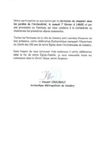 Le communiqué informant les paroissiens des différentes églises du diocèse sur cet événement.