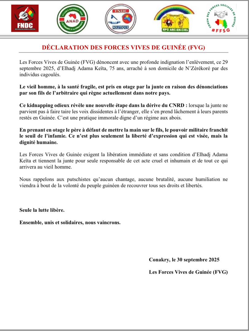 Home Société LA DISPARITION D’UN SEPTUAGÉNAIRE À N’ZÉRÉKORÉ PRÉOCCUPE LES FORCES VIVES LA DISPARITION D’UN SEPTUAGÉNAIRE À N’ZÉRÉKORÉ PRÉOCCUPE LES FORCES VIVES By L'Equipe de la Rédaction - 1 octobre 2025 21805 Facebook Twitter Pinterest WhatsApp Notre desk a eu vent de cette information par le biais d’une déclaration rendue public par les Forces vives de Guinée, dont nous vous invitons de lire, ci-dessous: