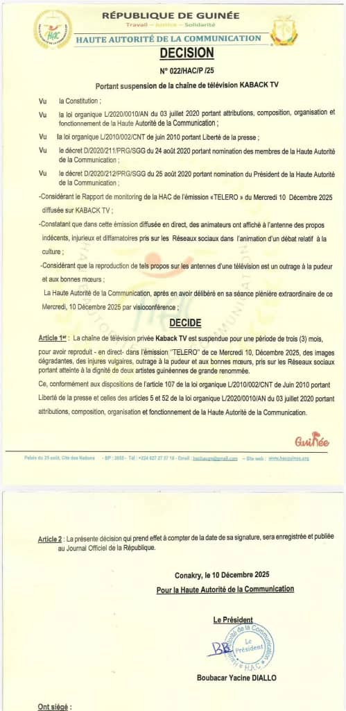 À en croire, l’institution qui régule les médias en République de Guinée, la Haute Autorité de Communication (HAC) les « dérapages » constatés lors de la réalisation d’une émission dénommée « Telero » serait à l’origne de cette suspension.