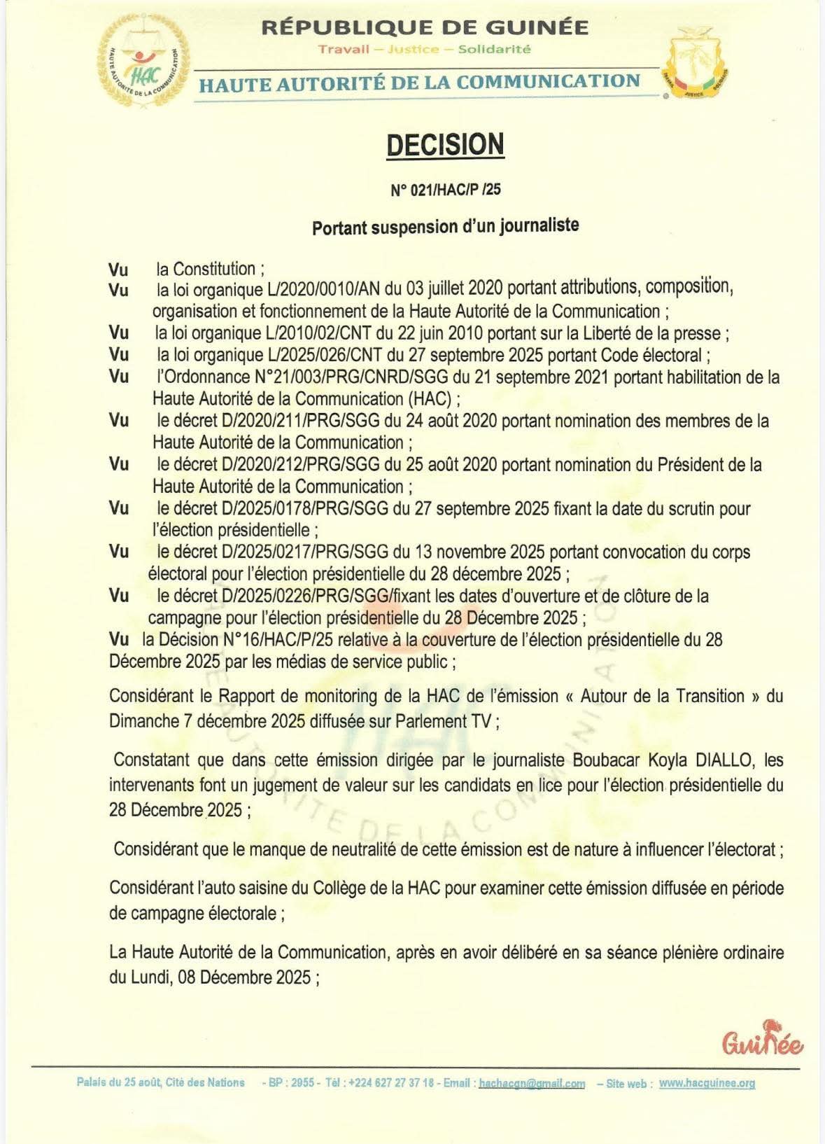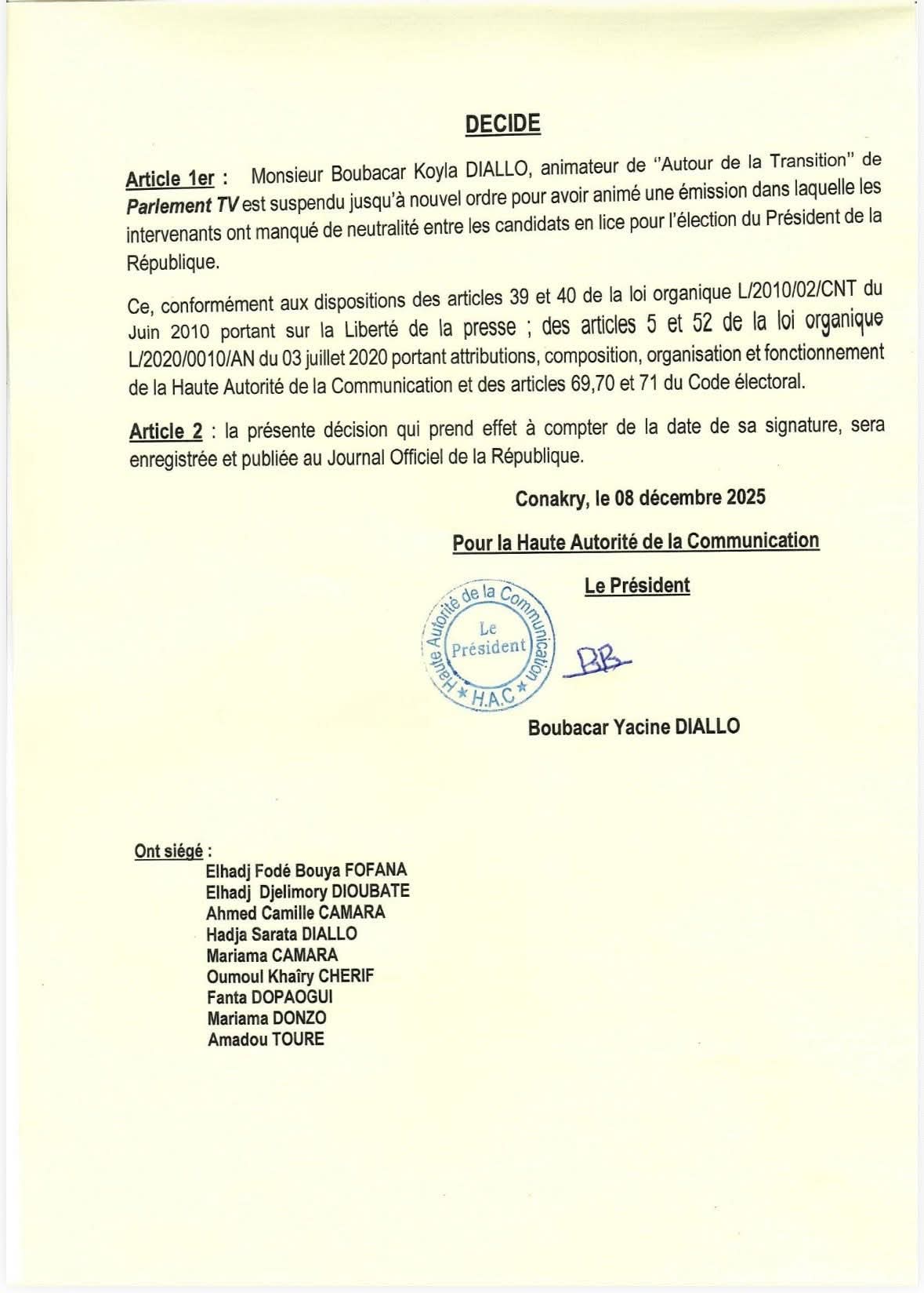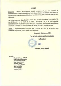 La Haute Autorité de la Communication (HAC) a annoncé, ce lundi 8 décembre 2025, la suspension « jusqu’à nouvel ordre » du journaliste Boubacar Koyla Diallo, animateur de l’émission Autour de la Transition diffusée sur Parlement TV.
