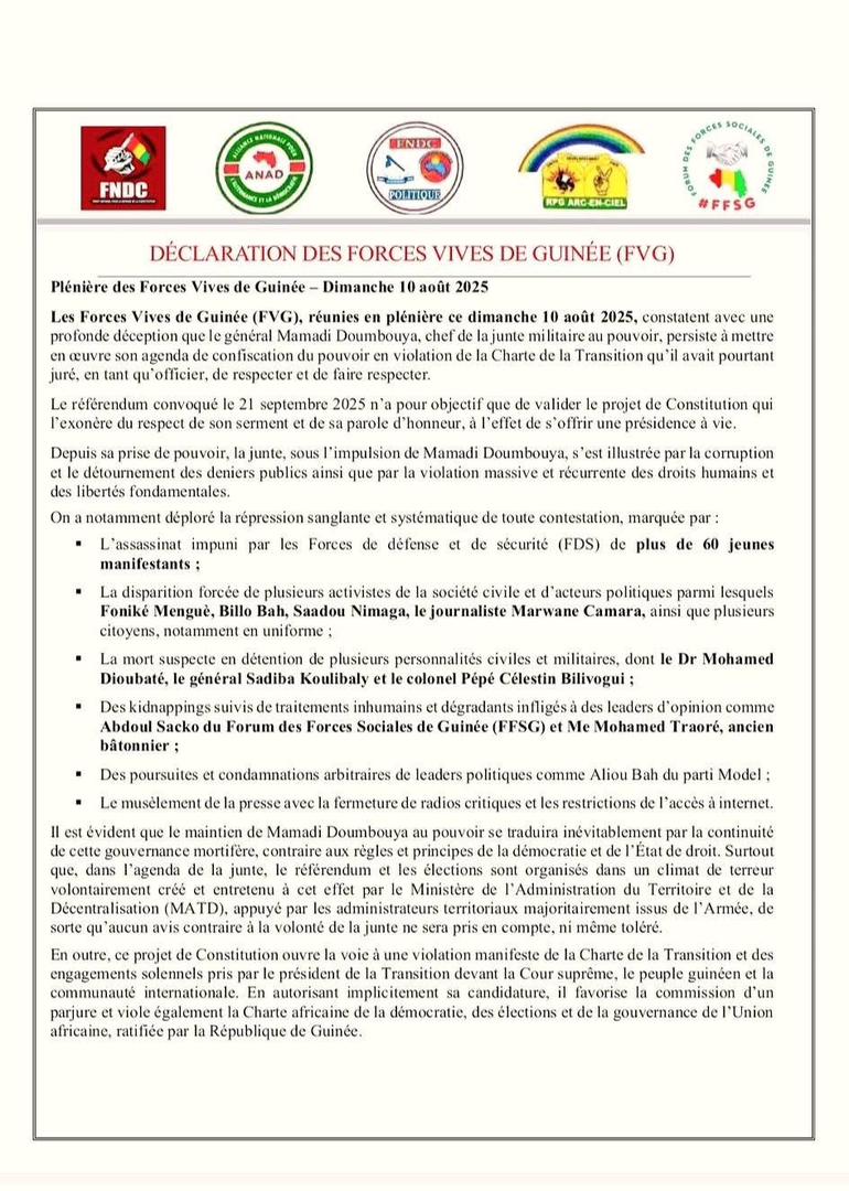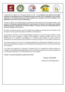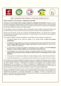 Home Société MANIFESTATION PACIFIQUE: UNE DATE BUTOIR DES FORCES VIVES DE GUINÉE MANIFESTATION PACIFIQUE: UNE DATE BUTOIR DES FORCES VIVES DE GUINÉE By L'Equipe de la Rédaction - 11 août 2025 24096 Facebook Twitter Pinterest WhatsApp Le 5 septembre 2025, reste la date que la coalition de la société civile et de la classe politique guinéenne a mentionné, si les remarques des FVG ne sont pas satisfaits. Ci-dessous, la déclaration: