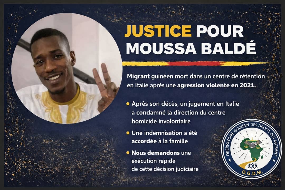 L’Observatoire Guinéen des Droits des Migrants (OGDM) informe l’opinion publique qu’un jugement de première instance a été rendu au tribunal de Turin le 11 Fevrier 2026. Concernant le décès de Moussa Baldé(PAIX À SON AME), migrant guinéen décédé le 23 MAI 2021 dans le CPR de Turin après une agression violente.