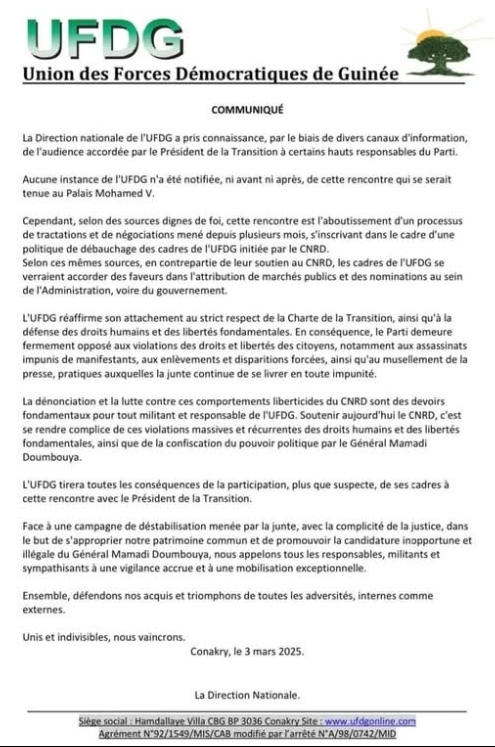 Ci-dessous, le communiqué de la direction nationale de l’Union des forces démocratiques de Guinée (UFDG).