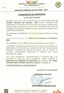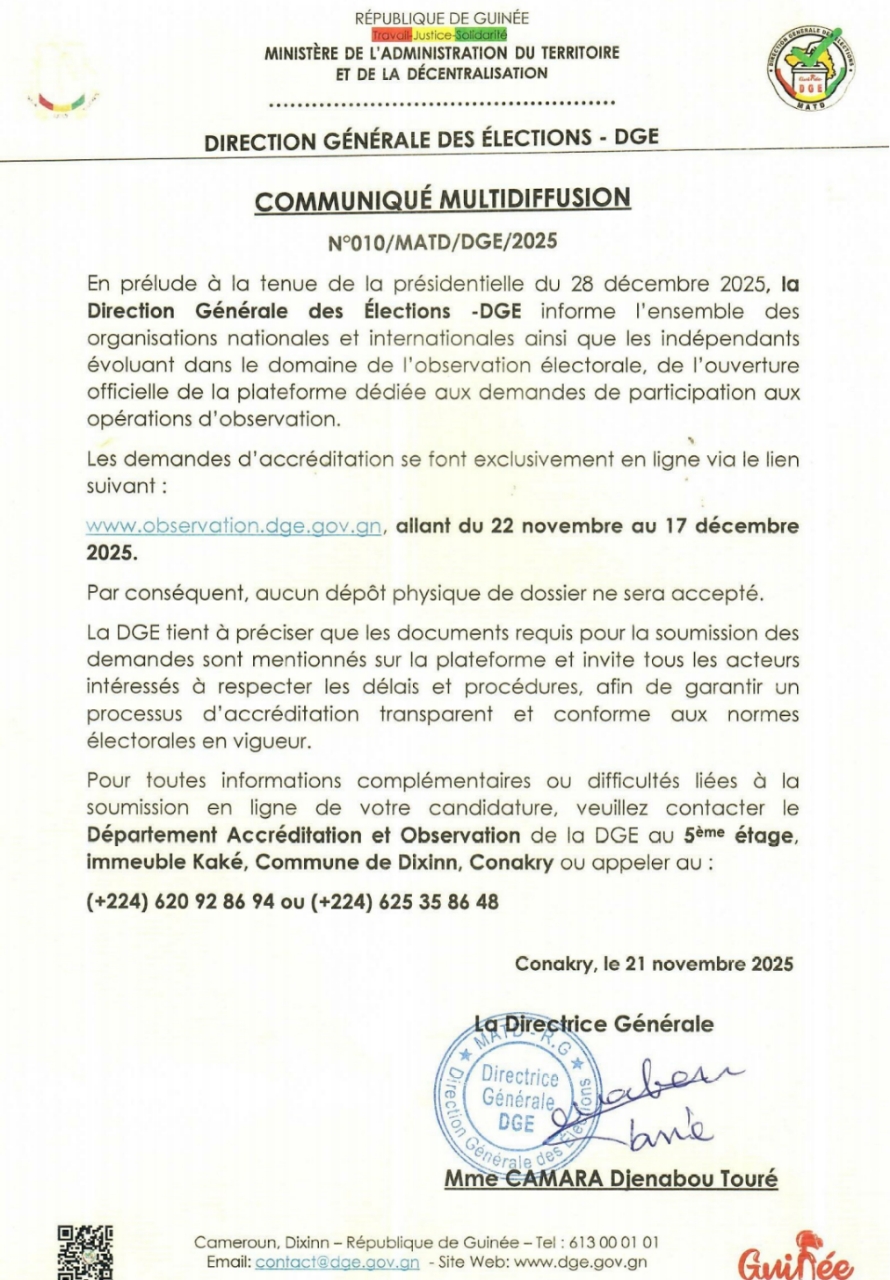 À près d’un mois et demi du scrutin présidentiel prévu le 28 décembre 2025, la Direction Générale des Élections (DGE), dirigée par Dame Djenabou Touré, annonce l’ouverture officielle de la plateforme destinée aux demandes d’accréditation des observateurs électoraux. Ci-dessous l’intégralité du communiqué :