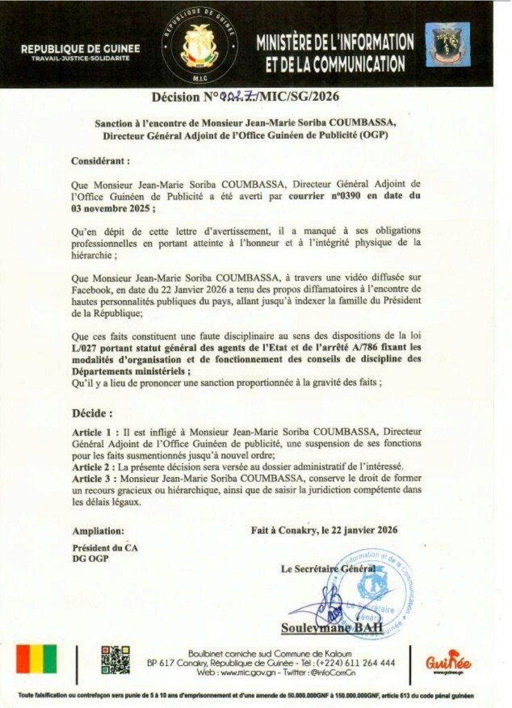 Le ministère de l’Information et de la Communication (MIC) vient de prendre une mesure lourde de conséquences. Par décision du secrétaire général, Souleymane Bah, Jean-Marie Soriba Coumbassa, directeur général adjoint de l’Office guinéen de publicité (OGP), est suspendu de ses fonctions jusqu’à nouvel ordre.