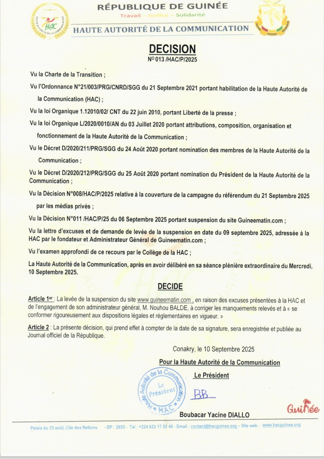 La Haute Autorité de la Communication (HAC) a annoncé, ce mercredi 10 septembre 2025, la levée de la mesure de suspension qui frappait le site d’information Guineematin.com.