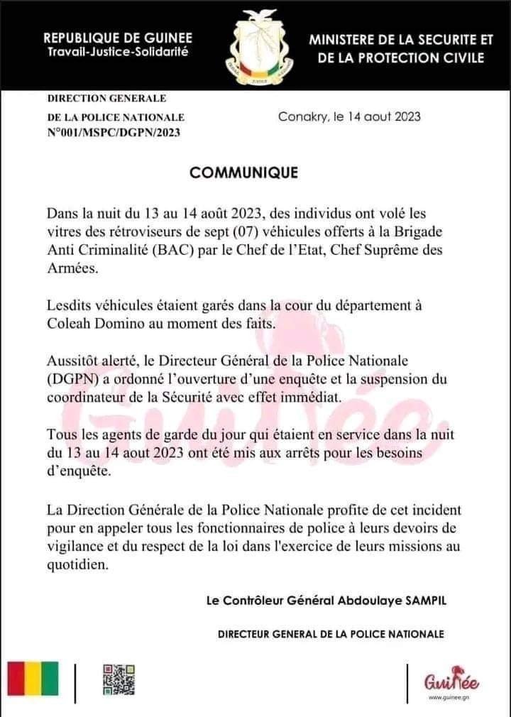 Une information qui contininue de faire couler beaucoup d’encre et de salive ». C’est un vol de vitres des rétroviseurs de sept (07) véhicules offerts à la Brigade Anti Criminalité (BAC) par le président de la transition, le colonel Mamadi Doumbouya. L’acte s’est produit dans la nuit du 13 au 14 août 2023 au ministère en charge de la Sécurité et de la Protection Civile. Ci-dessous, le communiqué du contrôleur général :